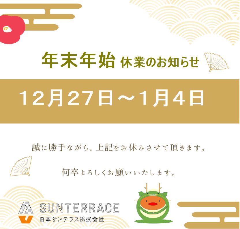 休業中のお問い合わせにつきましては営業日の2026年1月5日(月)より順次ご対応とさせていただきますので、ご理解・ご了承のほどお願い申し上げます。